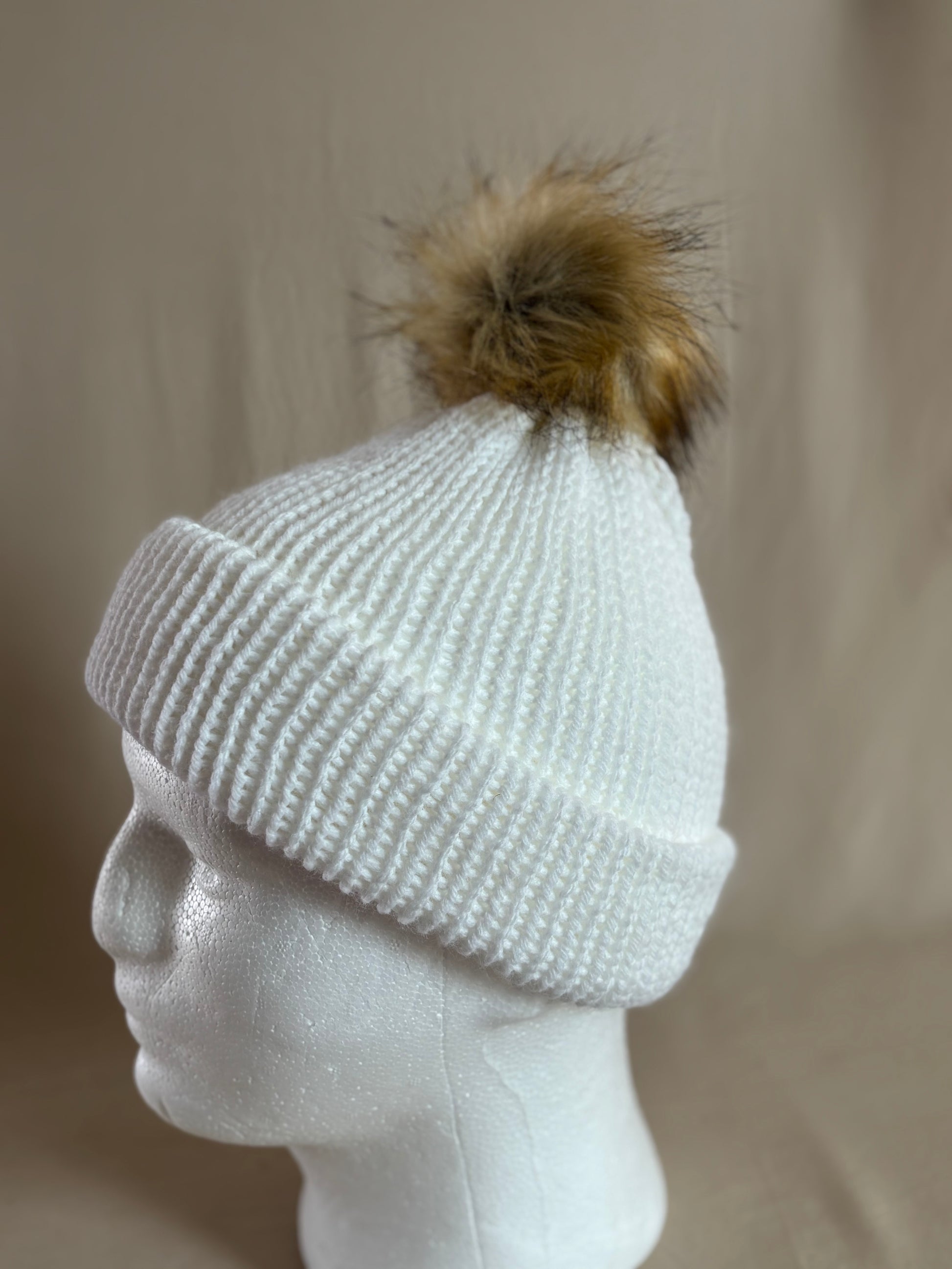 Fresh, classic, and endlessly cozy — our Snow White Ribbed Beanie with Faux Fur Pom is a must-have for winter days. Hand-crocheted with soft, durable yarn, this beanie features a ribbed texture that stretches comfortably to fit, plus a fold-over brim for added warmth. Finished with a fluffy faux fur pom in warm natural tones, it’s the perfect mix of timeless style and playful charm.