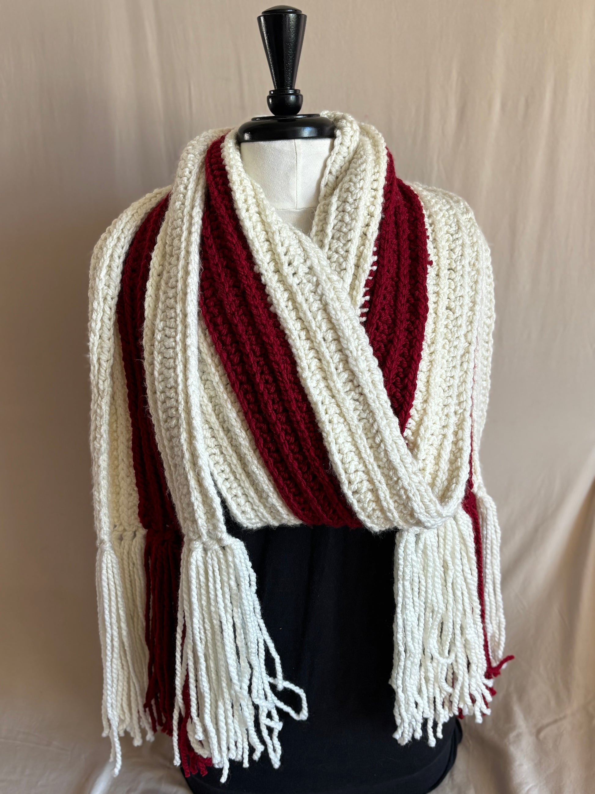 Stay cozy and stylish all winter long with our Highline Scarf, a bold mix of classic red and crisp white. Hand-crocheted with care, this soft ribbed scarf features long playful fringe and just the right amount of stretch for easy wrapping and layering.